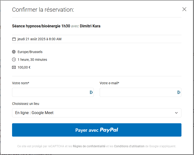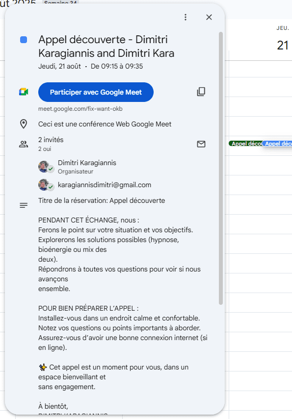 Choisissez la méthode pour le RDV soit en Zoom ou en Google Meet. Ajoutez si vous le désirez la raison de la replanification.